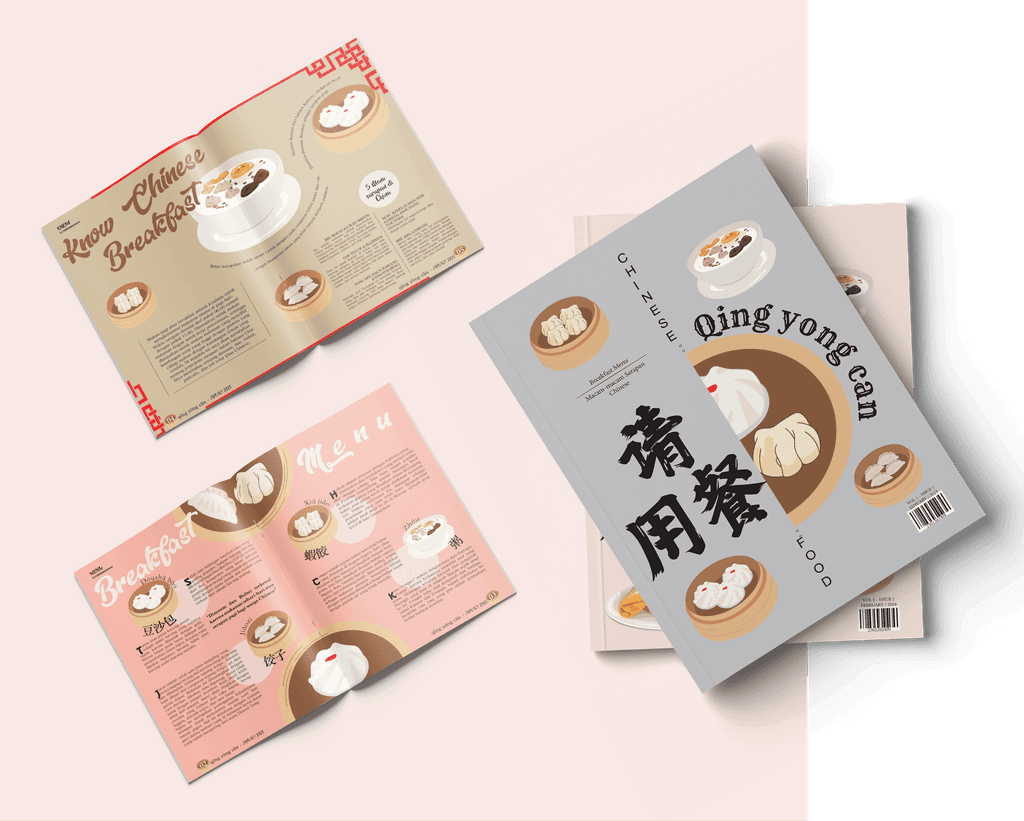 Chinese Food Magazine with the title "Qing Yong Can" in Mandarin which means "Please Eat". The contents of the magazine contain various Chinese breakfast menus and explanations of the food on the various menus, explanations of Chinese Breakfast.