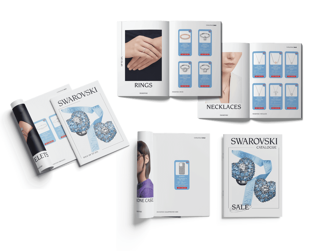 Swarovski's catalog concept with the theme "Chic Sophistication" features neutral or transparent crystal elements with an elegant and minimalist design, emphasizing elegance and simplicity. Accessories are chosen to attract attention without excessive detail, with touches of neutral colors such as white and metallics such as silver and gold, to add a chic and sophisticated impression.