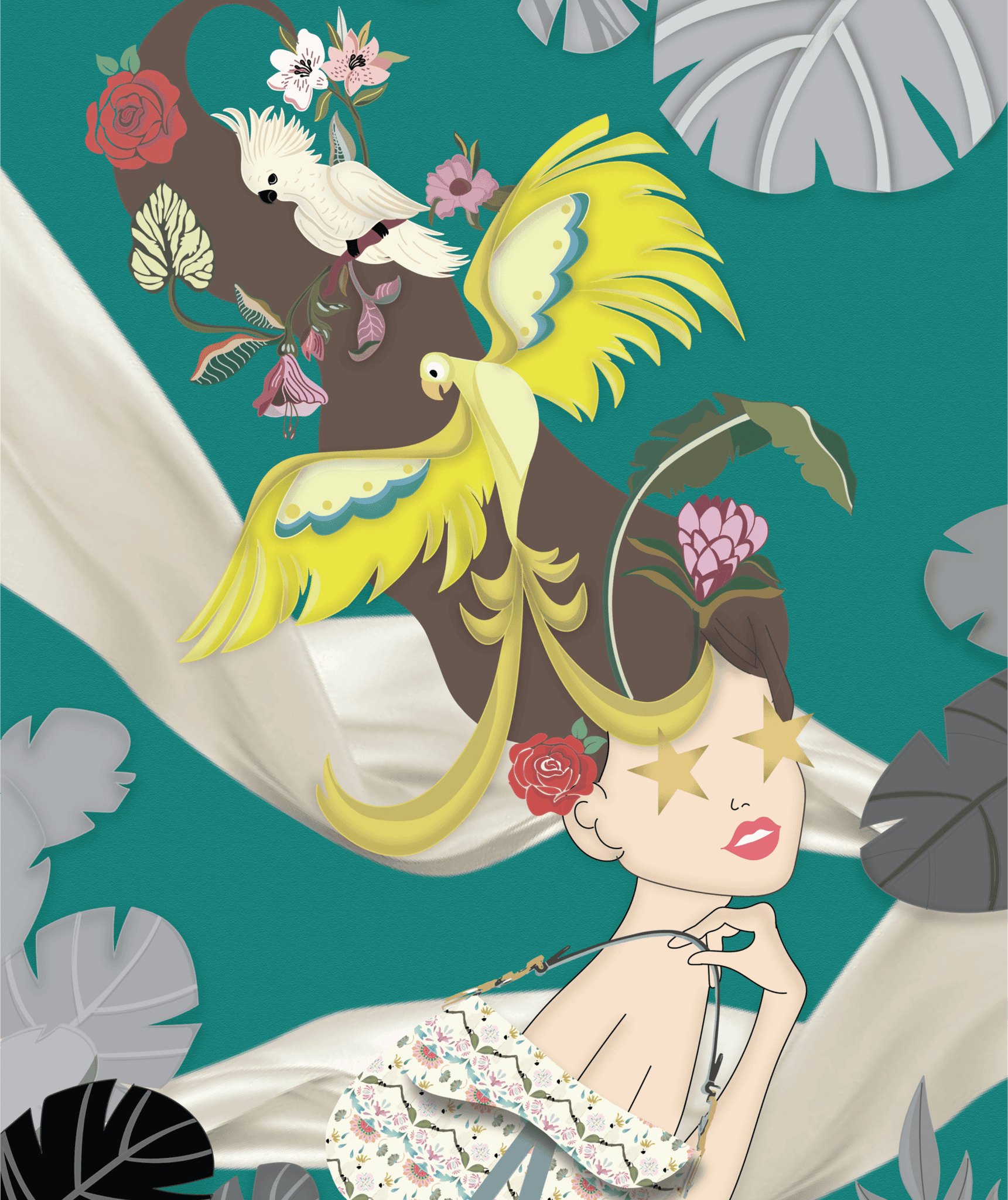 This illustration work combines bird motifs with floral and leaf elements, using a color palette of cream, pink, blue and green. The dominant colors are beige and pink, chosen to convey cheerfulness, confidence and feminine spirit. The background contains leaves, a symbol of growth, hope, and adaptation reflecting a woman's journey from unfreedom to freedom.